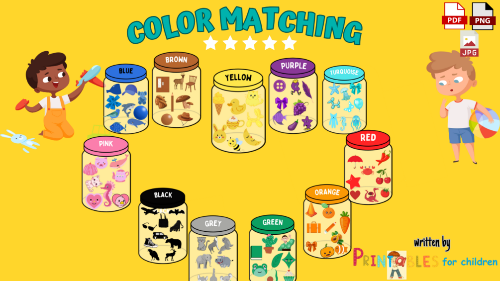 These color sorting jars are an entertaining way to teach preschoolers and young kindergarteners how to distinguish and sort colors.Kids may sort 93 things by color using 11 colored jars in this printable set. An excellent preschool or homeschooling activity and resource for toddlers!-------------------------------------------I N S T A N T ✱ D O W N L O A D-------------------------------------------A digital file is this one. You won't receive any tangible product in the mail.How it works?1) Purchase this printable2) Etsy will send you an email receipt and a download link3) Download the file4) Print PDF5) Use it for LIFE!intended for 8.5" x 11" paper printing. Printing on thick cardstock and laminating it is highly advised for durability and reusability.Small magnets or Velcro dots can also be used for assembly.If you have any queries or concerns about the product, don't hesitate to email me using the address below.printablesforchildren@gmail.com